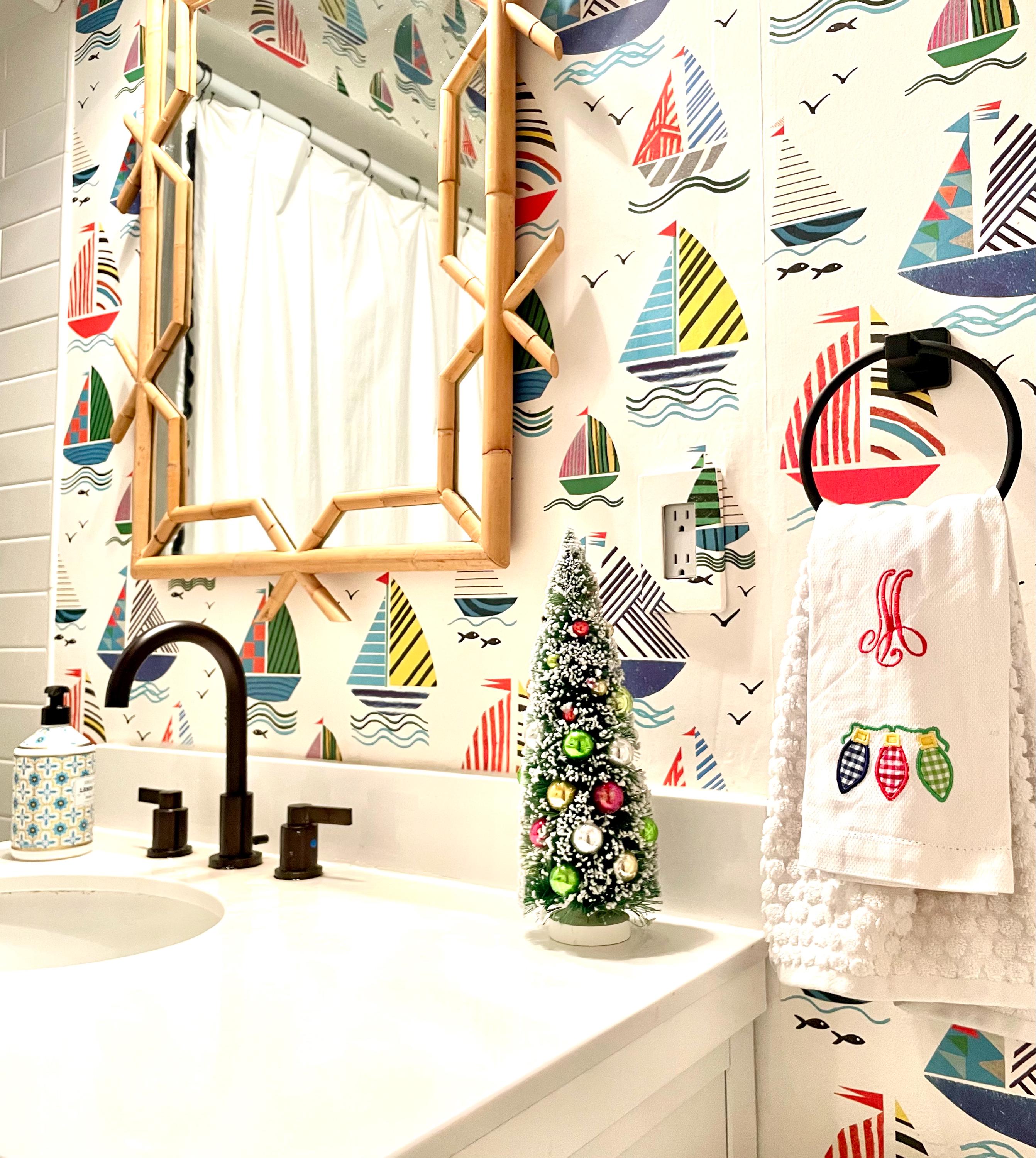 This special towel is adorned with appliqué Christmas lightst on our Huck Egyptian cotton hand towel which not only has great absorbency but also a look of sophistication with its subtle diamond weave pattern. This Christmas hand towel is the perfect holiday decor to your bathroom or kitchen (or a gift for a special friend).