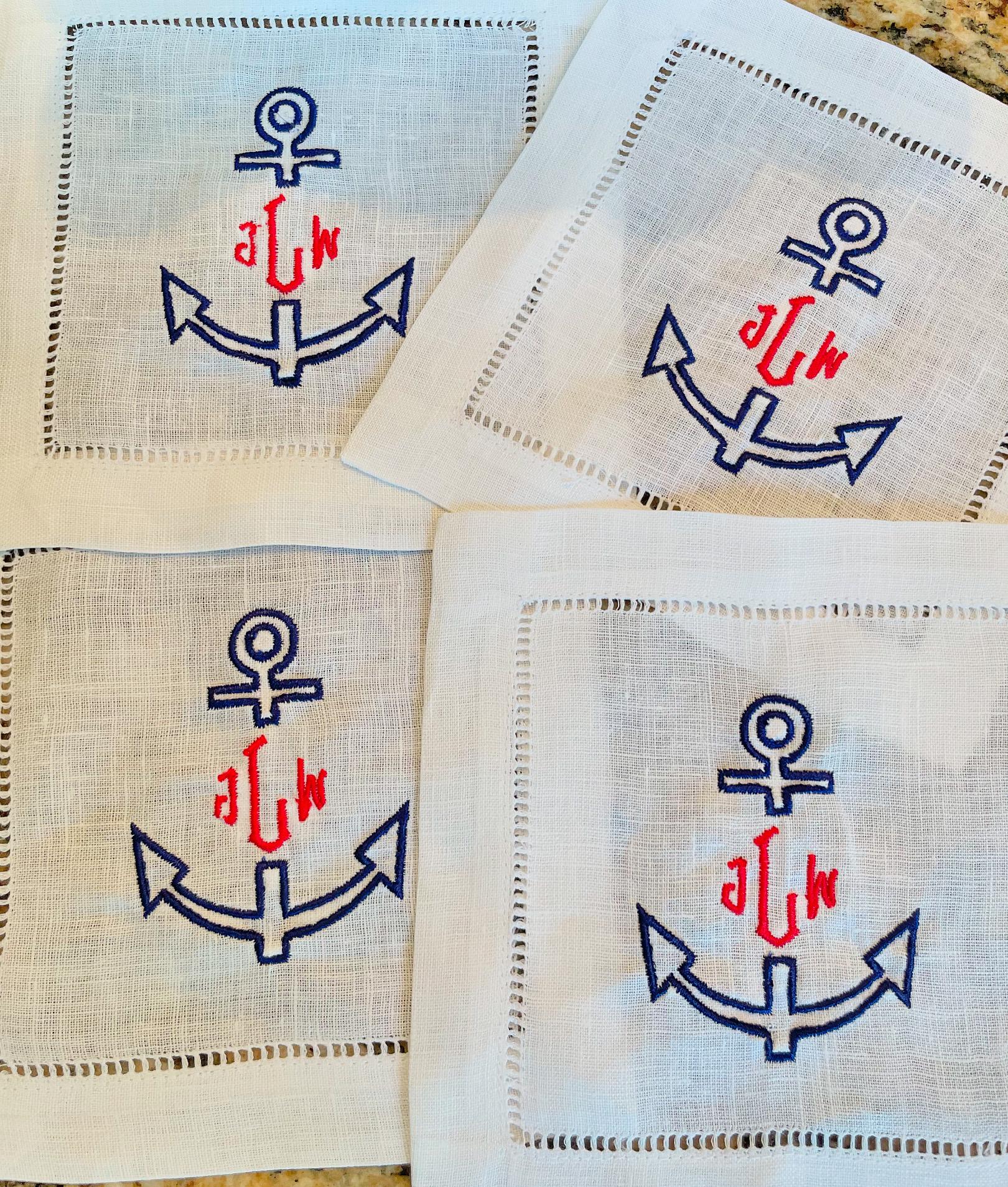 What better way to entertain elegantly than with nautical white hemstitch cocktail napkin/coaster adorned with an anchor surrounded by a custom monogram. Or make these pretty napkins a wedding gift for that new bride and groom with their new initials. Be sure to customize your thread color!