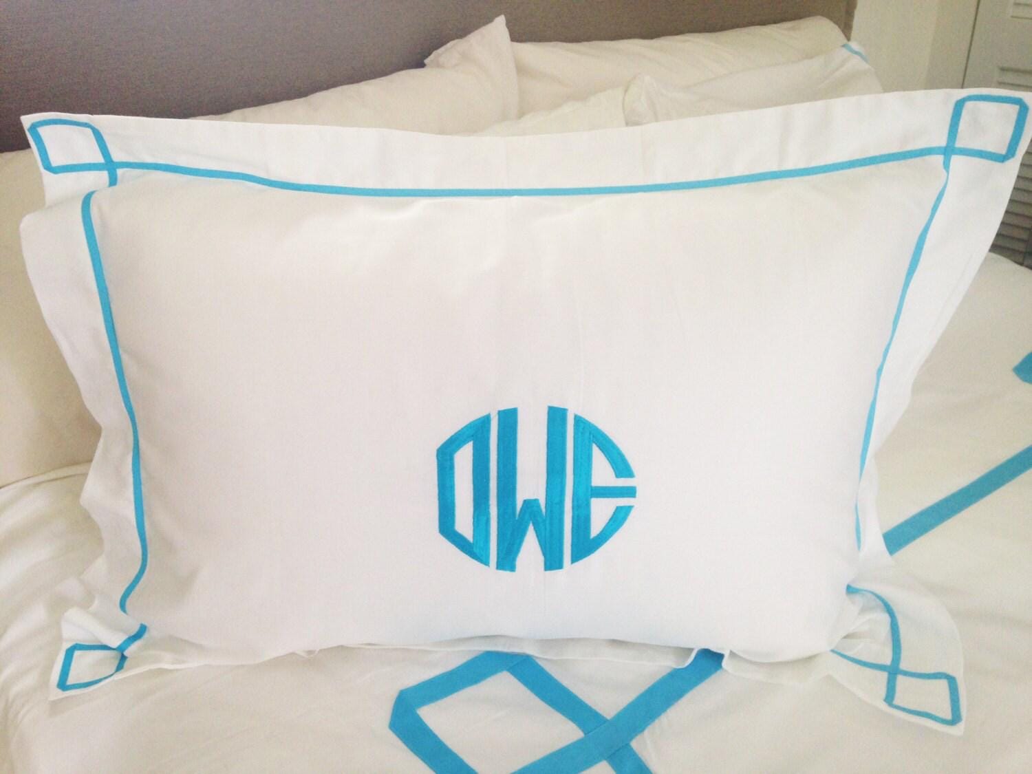 A monogrammed sham can truly make a bed look complete. We took a white standard sham and added a pretty trestle trim. Choose your custom color grosgrain ribbon to the border to really give a pop of color and frame a pretty monogram for the perfect bedding.