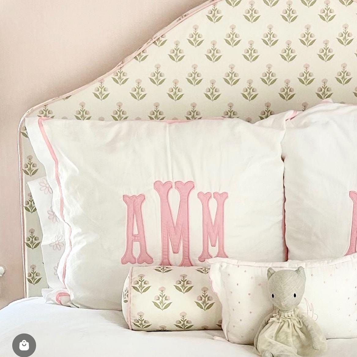 Applique monogram is the unique design of using pieces of fabric to create a beautiful monogram. Each sham is framed with a matching grosgrain ribbon.
