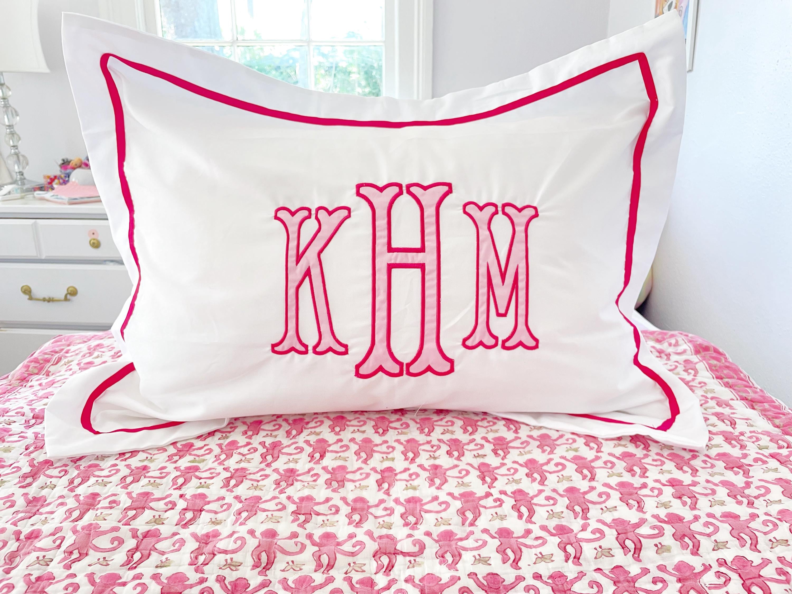 Applique monogram is the unique design of using pieces of fabric embroidered on to create a beautiful, custom monogram. Each sham is framed with a matching grosgrain ribbon elevating your bedroom to an elegant oasis.