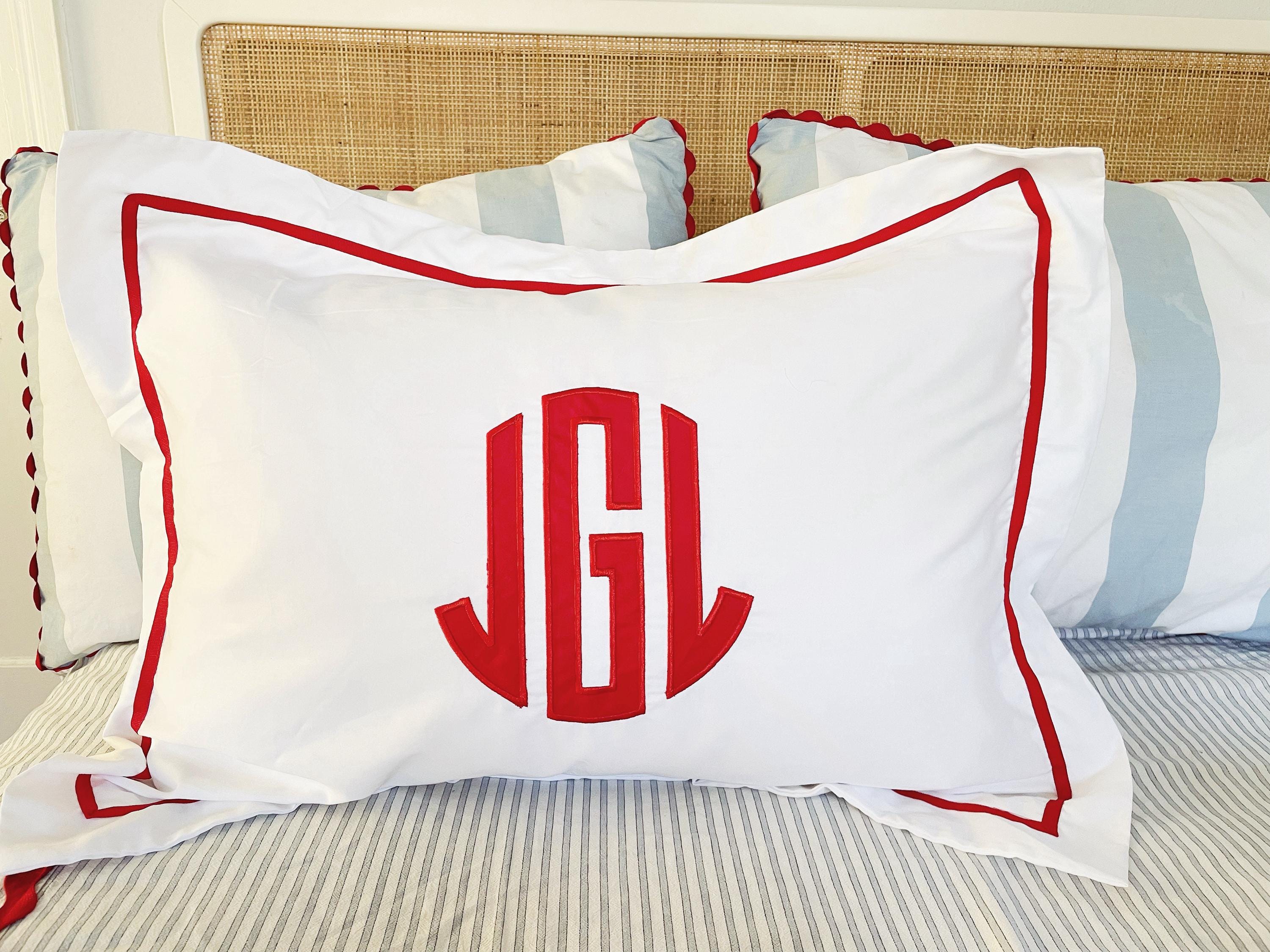 Applique monogram is the unique design of using pieces of fabric embroidered on to create a beautiful, custom monogram. Each sham is framed with a matching grosgrain ribbon elevating your bedroom to an elegant oasis.