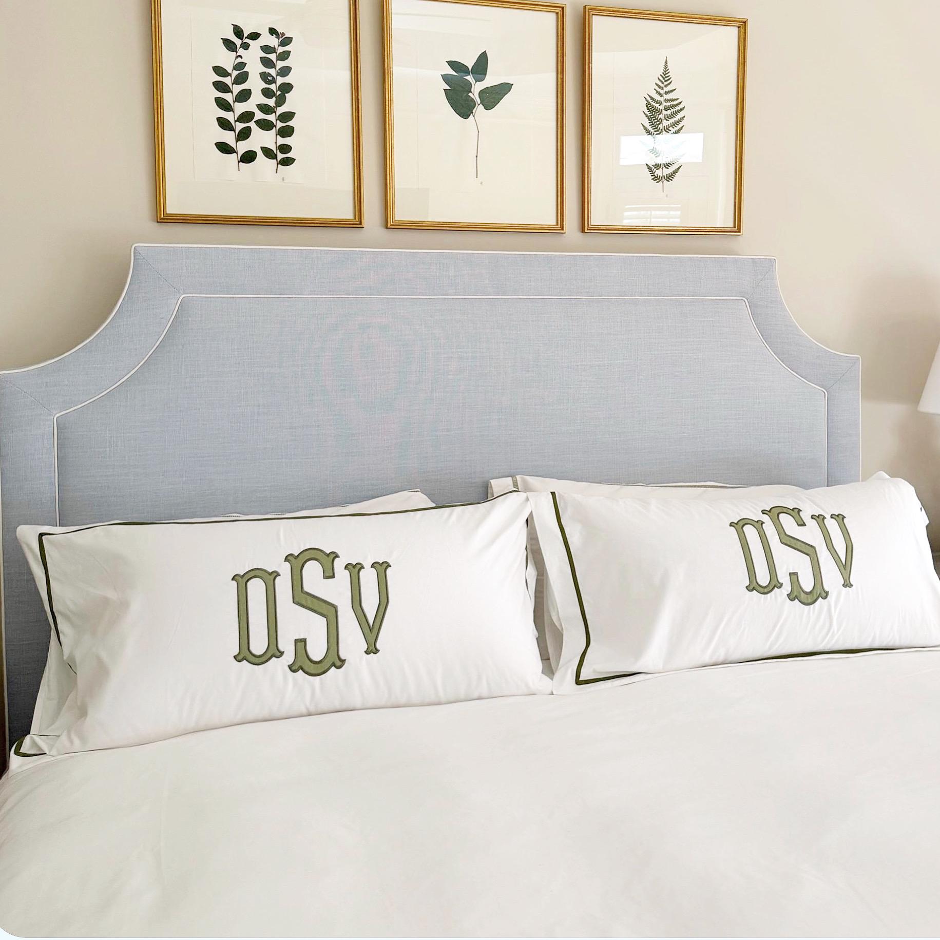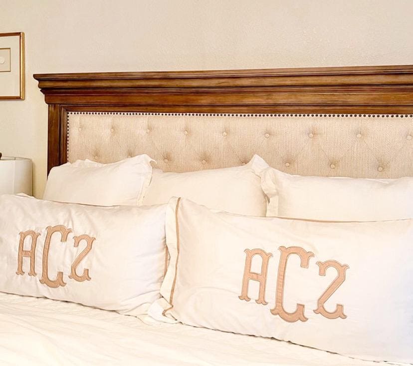 Applique monogram is the unique design of using pieces of fabric to create a beautiful, custom monogram. Each sham is customized with a grosgrain ribbon soft Egyptian 100% Cotton. Have a specific color in mind or questions about colors? Contact us and we will see if we can match it.