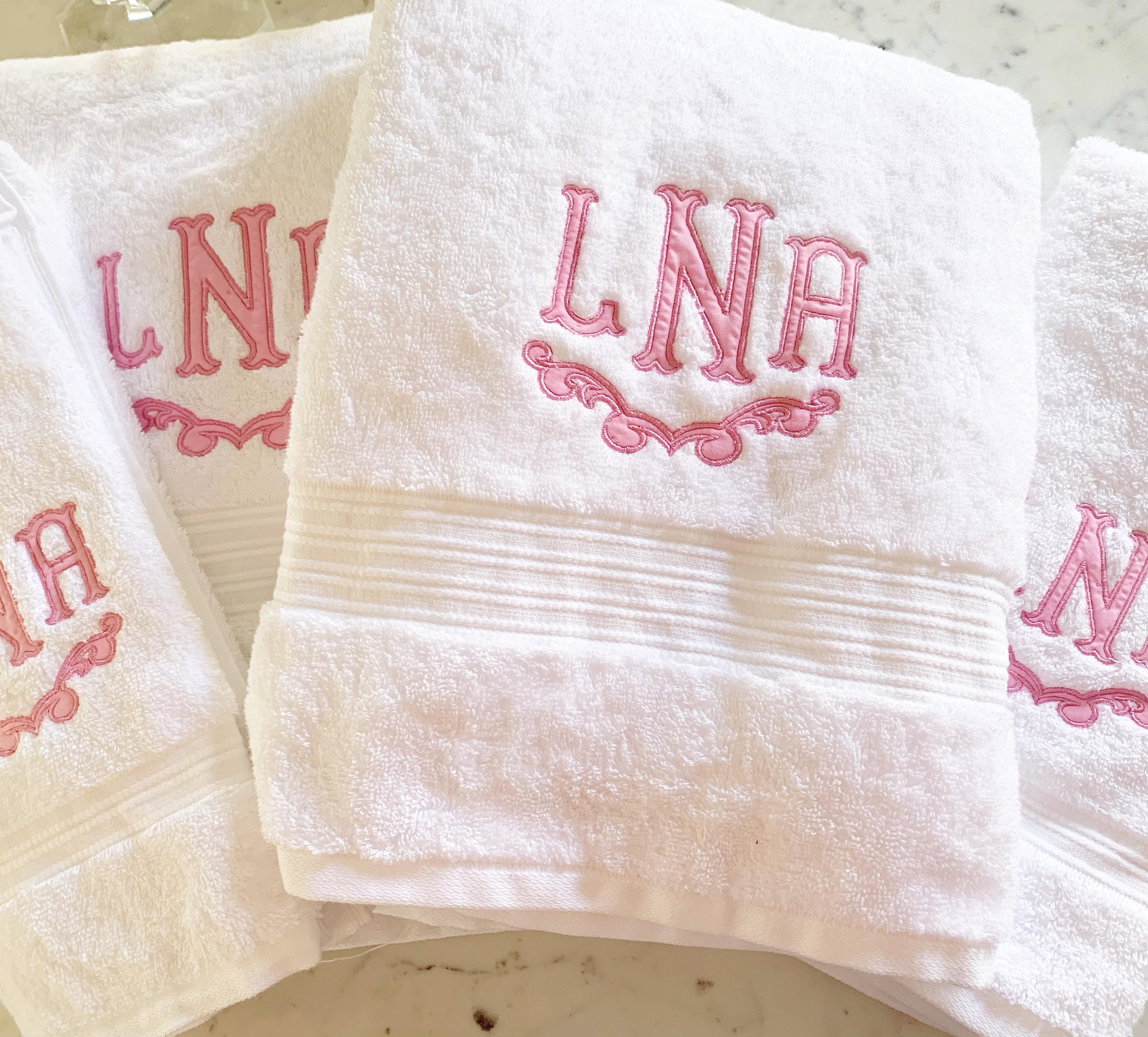 Bring a fresh twist to classic personalization with these applique monogrammed bath towels. They add an instant elegance to your bathroom and make a thoughtful, memorable wedding or housewarming gift. Luxuriously absorbent and beautifully finished, each bath towel is tailored to your taste—choose your thread and fabric colors for a truly custom touch.