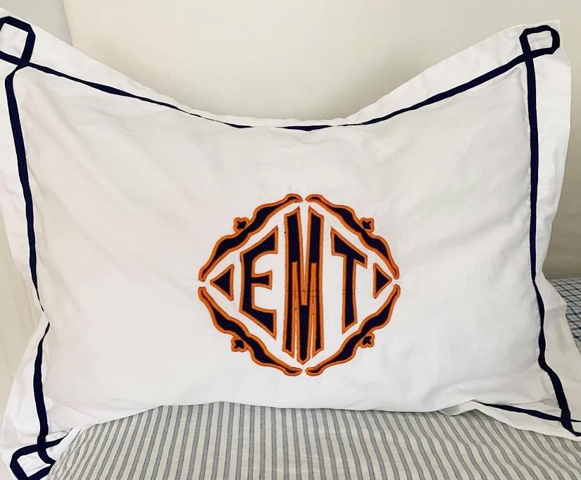 Applique monogram is the unique design of using pieces of fabric to create a beautiful monogram. This sham has a unique trestle trim to frame the beautiful monogram.